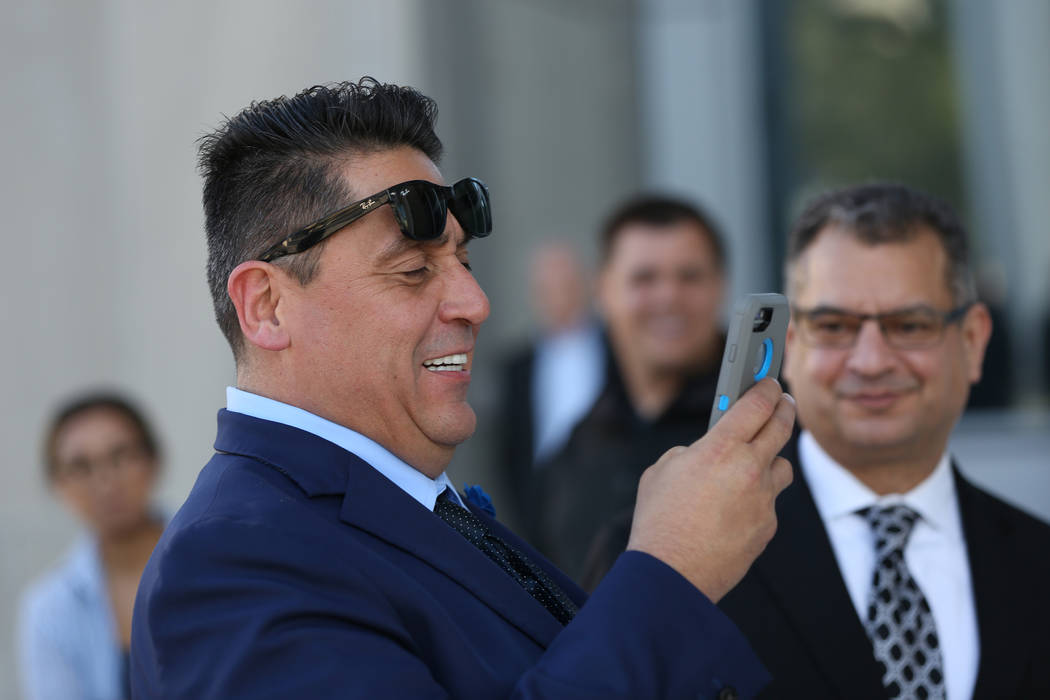 Bradley Campos, one of eight Vagos Motorcycle Club members who were acquitted of all charges, celebrates with friends and family outside the federal ...